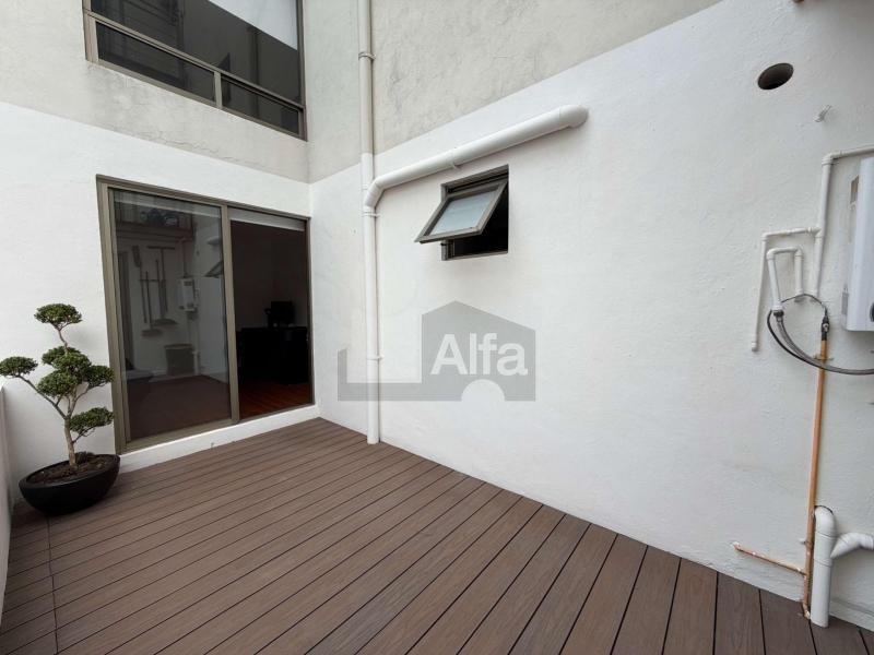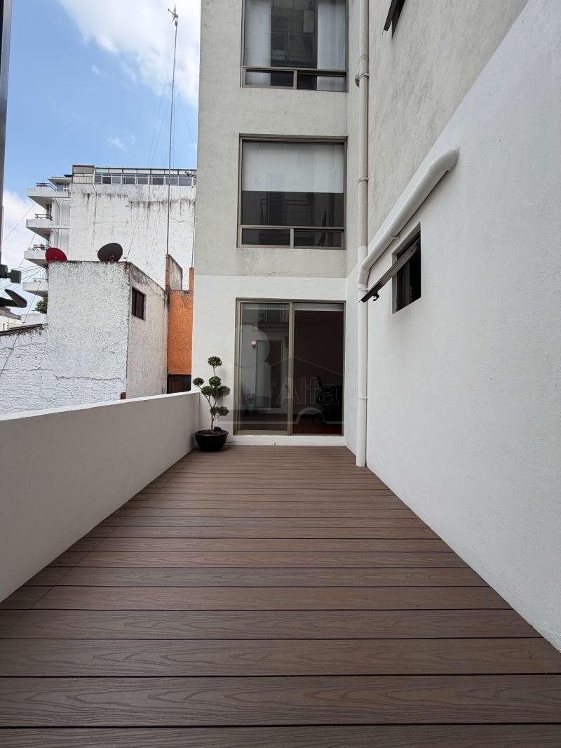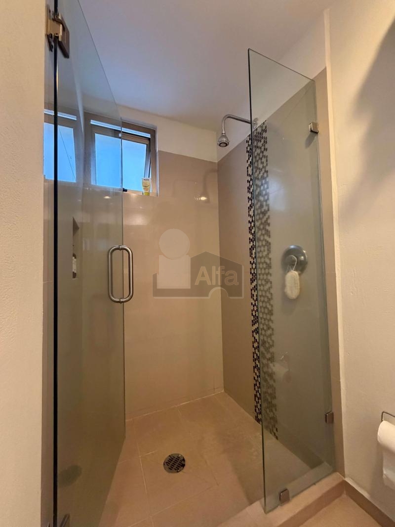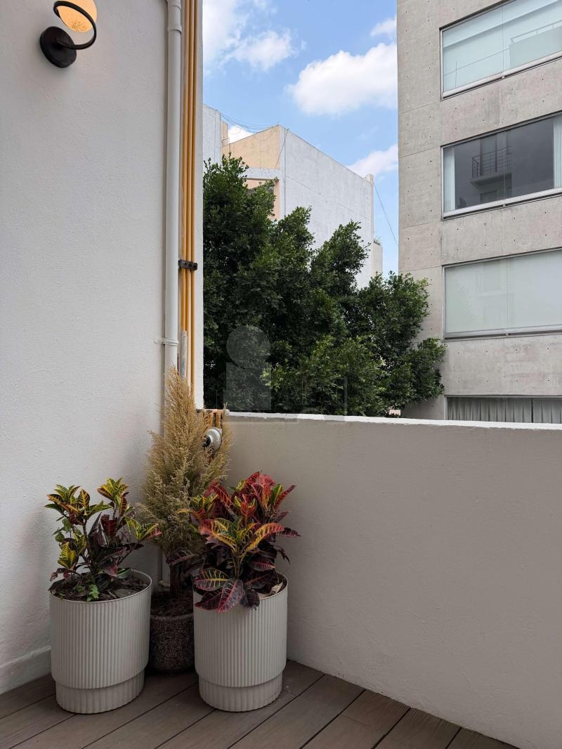 Las habitaciones pueden ser un santuario de serenidad al contar con cálidos pisos de madera y amplios armarios. Las puertas corredizas de vidrio conducen a un balcón privado, ofreciendo una extensión tranquila al aire libre de su espacio vital. El baño es un ejemplo de diseño moderno, con elegantes accesorios y una pared texturizada que realza el interés visual. Cada habitación cuenta con su propia terraza, convirtiéndolo en una característica única de este departamento, jamás se sentirá encerrado pues siempre podrá dar un paso y disfrutar del aire con la privacidad que sólo este departamento puede entregar.